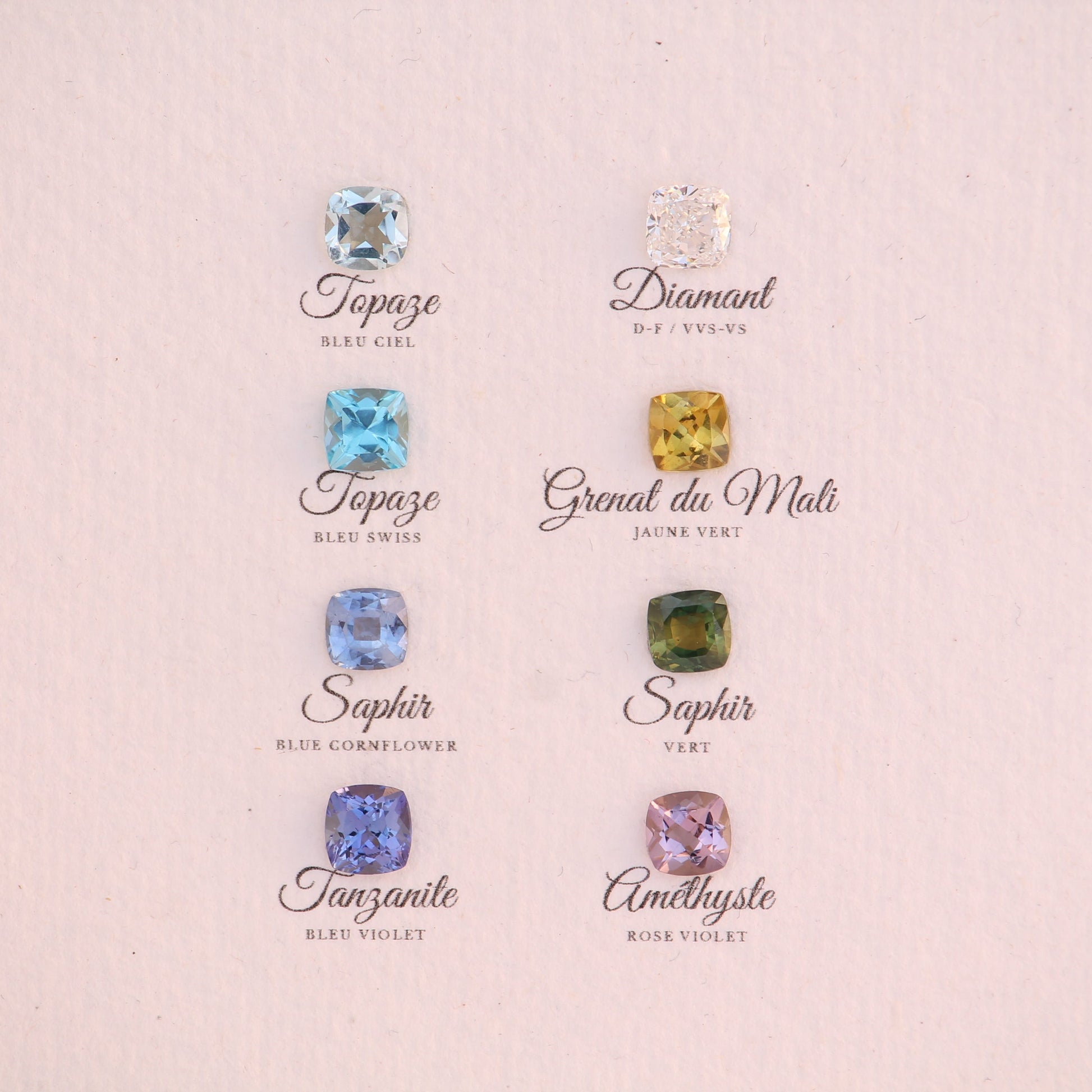 Si la gemme souhaitée n’apparaît pas dans les options proposées, n’hésitez pas à nous contacter via l’onglet « Nous contacter » pour nous faire part de votre demande. Nous nous ferons un plaisir d'étudier ensemble les possibilités.